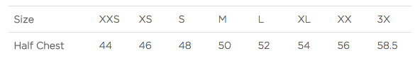 | Half Chest (cm) | 35 | 37.5 | 40 | 42.5 | 45 | 47.5 | 50 |